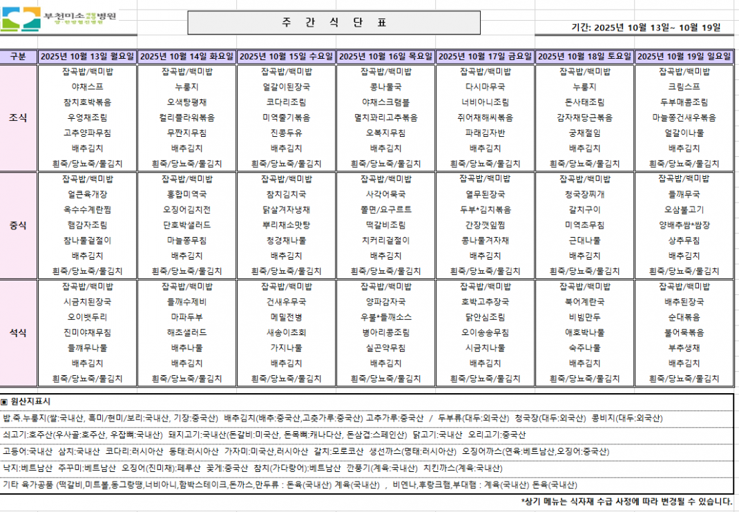 식단표 페이지 정보 작성자 관리자 댓글 0건 조회 66회 작성일 25-10-13 07:27 본문 목록 다음글상두대 옮기는 과정 ♥ 25.07.21 댓글목록 댓글목록 등록된 댓글이 없습니다.